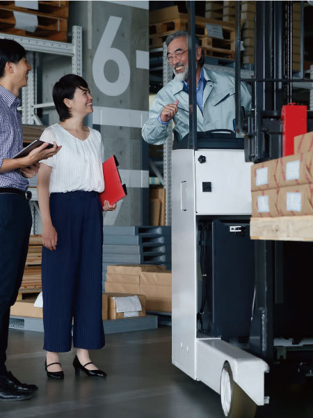 物流センター内ではたくさんの人が働いていて、まわりの人に配慮した運転が必要となります。